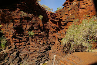 We had been told that access to Joffre Gorge was round the back of the resort so off we went in late morning and found a rather well hidden track which soon lead us down a side gorge into the floor of the main gorge just down stream of Joffre Falls, which only flows during rain storms. There was a long narrow pool of water in the base of the gorge and we decided to swim along it as we had brought our swimmers and towels. The sides were of highly layered iron stone and iron ore and stood vertically 70 m above us. The gorge was 10 - 20m wide and the water was comfortable.