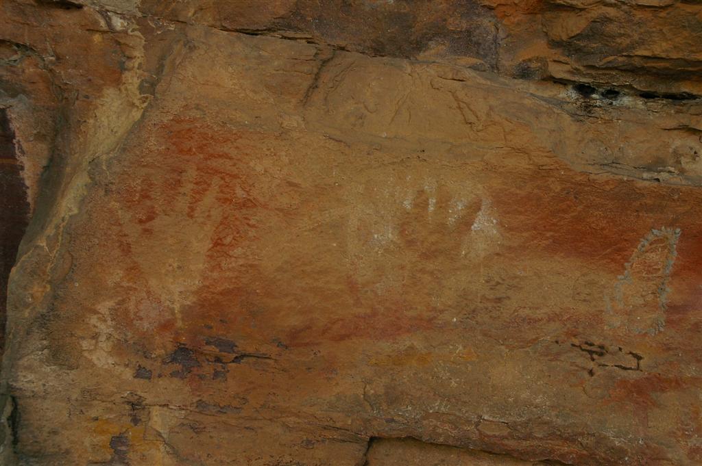shelter cave that was used for 1000's years and has 2 m of archealogical debris on the floor. Then we walk along the base of the vertical rock cliff and saw 3 art sites with the iconic images